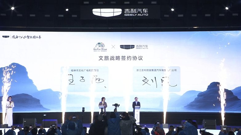活动中,双方正式签约,将桂林山水IP与吉利汽车品牌深度绑定,丰富文旅消费业态。合作聚焦桂林山水文化、历史和非遗民俗,联合开发五大主题自驾路线,涵盖山水观光、非遗体验和户外运动。此举将桂林升级为出行美学共创者,通过汽车传递人文精神。双方将打造集汽车展示、试驾、露营和文旅体验于一体的标杆场景,探索产业融合新路径。