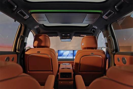 对于大六座SUV来说,第二排乘员的出行体验永远是产品核心价值。打开车门就能见到类似豪华商务车的两个NAPPA头层皮独立座椅,内置22个按摩点,支持一键躺平与腿托四向调节,配合4处手机无线充电(50W)、6窗遮阳帘、21.4英寸4K车顶翻折屏、头枕音响(共31个扬声器),绝对的视听体验拉满。