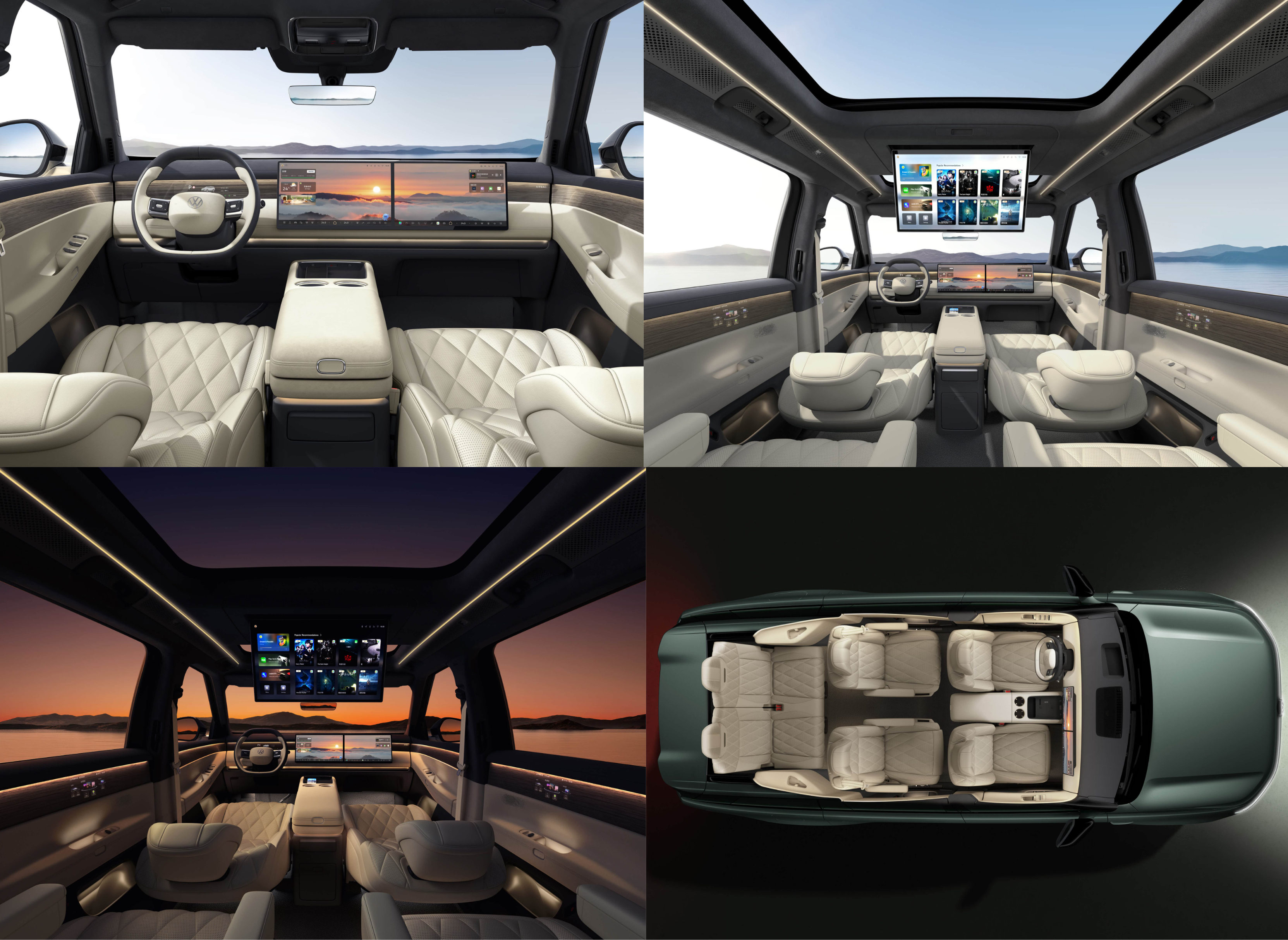内饰也有本色(米白)、锦橙、墨宝三种风格,并配备双15.6英寸一体式联屏、21.4英寸后排吸顶大屏以及12.8米环舱氛围灯,营造出满满的科技氛围。另外还将提供HUD抬头显示、双幅式多功能方向盘+电子怀挡、手机无线快充、二排零重力座椅、智能冷暖冰箱等舒适配置。另一亮点当属隐藏在木纹饰板中的Smart Surface魔术屏,包括智能仪表魔术屏以及二排门板智控魔术屏。
