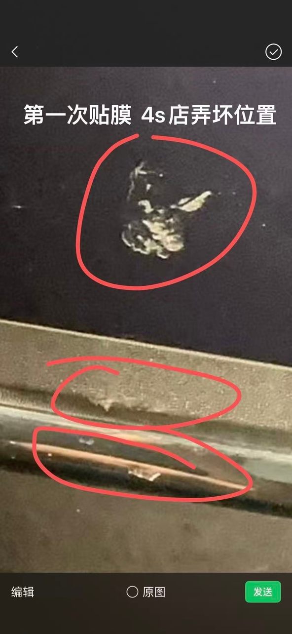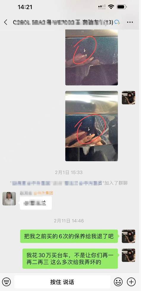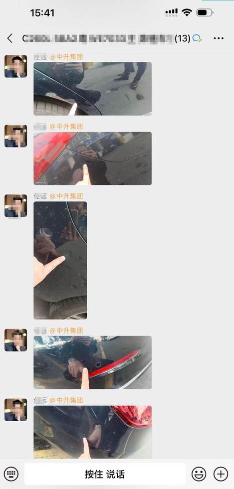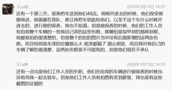 王女士强调,自己对爱车状况十分了解,主驾驶后侧车漆破损漏底漆、副驾驶车框划痕这两处明显损伤,送修前绝对不存在,损伤痕迹显眼、面积较大,不可能被遗漏拍摄。而且4S店工作人员存在明显失职,保养前后并未陪同她一同验车确认车况,即便工作人员有拍图发至相关群聊,她也留存了完整截图证据,足以佐证损伤为保养期间新增,可4S店依旧拒不承认。