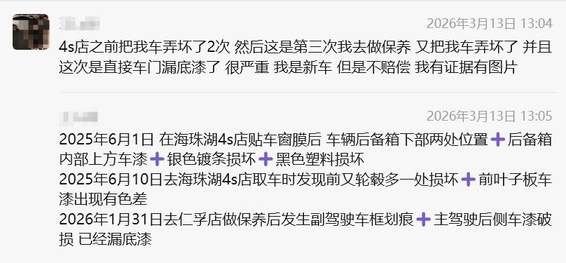 2026年1月31日,王女士前往仁孚店做保养,保养结束后发现车辆副驾驶车框有划痕,主驾驶后侧车漆破损且已漏底漆。王女士解释,前两次车辆损坏均发生在购车的4S店,后续因该4S店停业,被通知转至仁孚店做保养,第三次车辆损坏正是在这家门店保养期间发生。