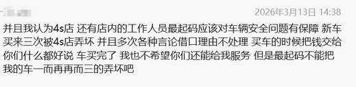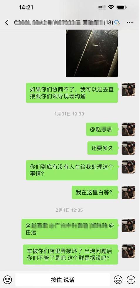 当然,更让王女士气愤的是,对于这些问题,4S店根本不回复!王女士认为,4S 店及其店内工作人员,最基本的职业操守应包含对车辆安全与车况的保障责任。一辆新买的车,短短时间内连续三次被 4S 店弄坏,本身已经说明管理或操作环节存在严重问题。更令人无法接受的是,在这期间,对方多次通过各种言论、借口理由拖延处理、回避责任。买车缴费时,对方百般殷勤、什么都好商量;可问题出现后,我不奢求他们能提供多优质的增值服务,最起码不能把我的车当作 “耗材”,一而再、再而三地肆意损坏吧。