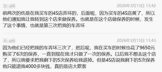 此外,王女士提及,自己购车时花费9650元购买了6次保养套餐,截至目前仅使用1次,因车辆三次被4S店损坏,后续不愿再前往该门店保养,遂要求退还剩余5次保养的费用。但4S店给出的退费方案仅为4000多元,远低于套餐剩余价值,王女士直言此举实属店大欺客。