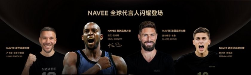 发布会上,NAVEE正式公布全球品牌代言阵容,包括篮球名人堂成员凯文·加内特 (Kevin Garnett)、法国足球传奇奥利维耶·吉鲁(Olivier Giroud)、西班牙足球新星费尔明·洛佩斯(Fermín López) 以及德国球星卢卡斯·波多尔斯基(Lukas Podolski)。