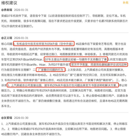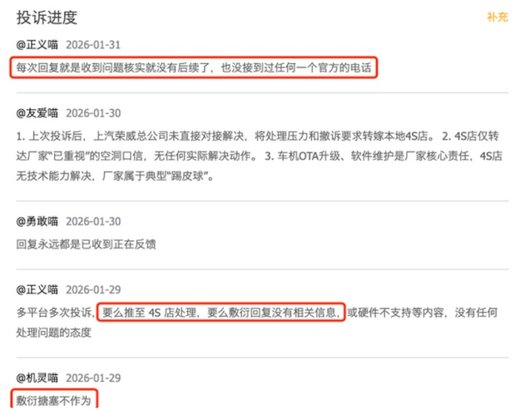 比起MG,荣威似乎野心更大,直接把“AI原生高端”当成核心战略,目标直指20万以上的高端市场,还放话要在2025—2026年通过“D家族”系列车型,重回自主第一阵营,月销冲击数万辆。听起来无比热血,但看看车主们的投诉,或许有些不尽人意。