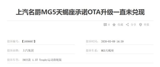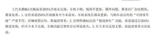 车质网上一位车主投诉:上汽名爵MG5天蝎座承诺OTA升级未兑现车,车机卡顿,地图不更新,硬件问题。仔细看了这个投诉,不难发现,车主的反馈还算比较理性,但也从侧面说明用户对品牌的期望值比较高。