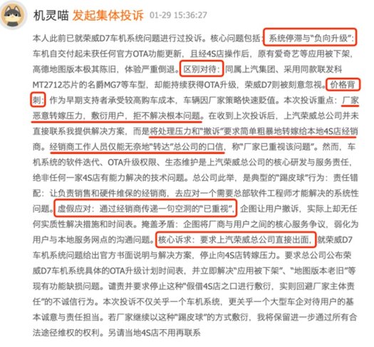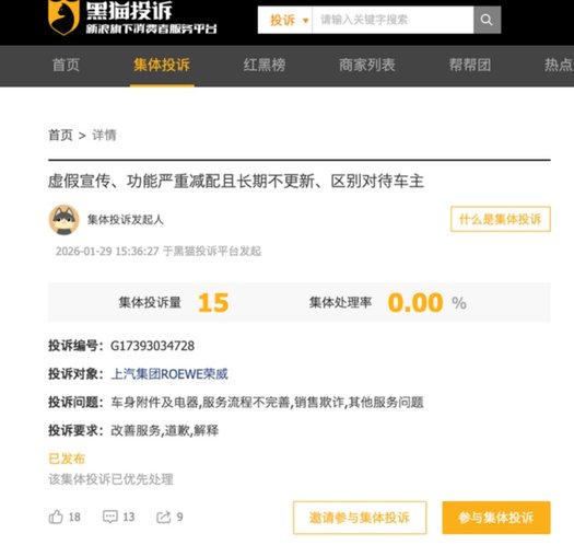 上个月,黑猫投诉平台上出现了一则关于荣威的集体投诉,涉及15位车主。投诉内容主要包括:车机系统长期未获得OTA更新、功能“暗改”、同硬件车型待遇不一致等问题。
