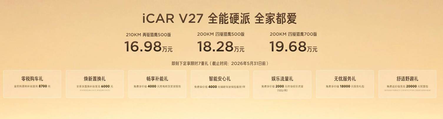 3月13日,iCAR V27正式上市,3款车型售价16.98-19.68万元,定位中大型方盒子SUV,瞄准家用与户外出行双场景。在方盒子SUV热度高涨、增程市场竞争趋缓的当下,这款承载iCAR品牌向上突破的旗舰车型,能否打破竞品两极分化的格局,成为2026年第一个爆款新车吗?