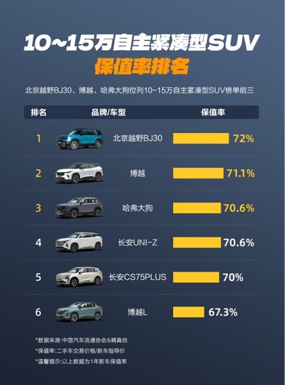 在竞争激烈的10-15万自主紧凑型SUV市场,BJ30脱颖而出,拿下榜单第一,远超同级竞品,成为该细分市场名副其实的 “保值王”。高保值率不仅让 BJ30 在二手市场拥有更强的抗跌能力,更体现出其在产品品质、用户口碑与长期价值层面的全面领先。
