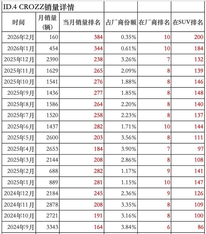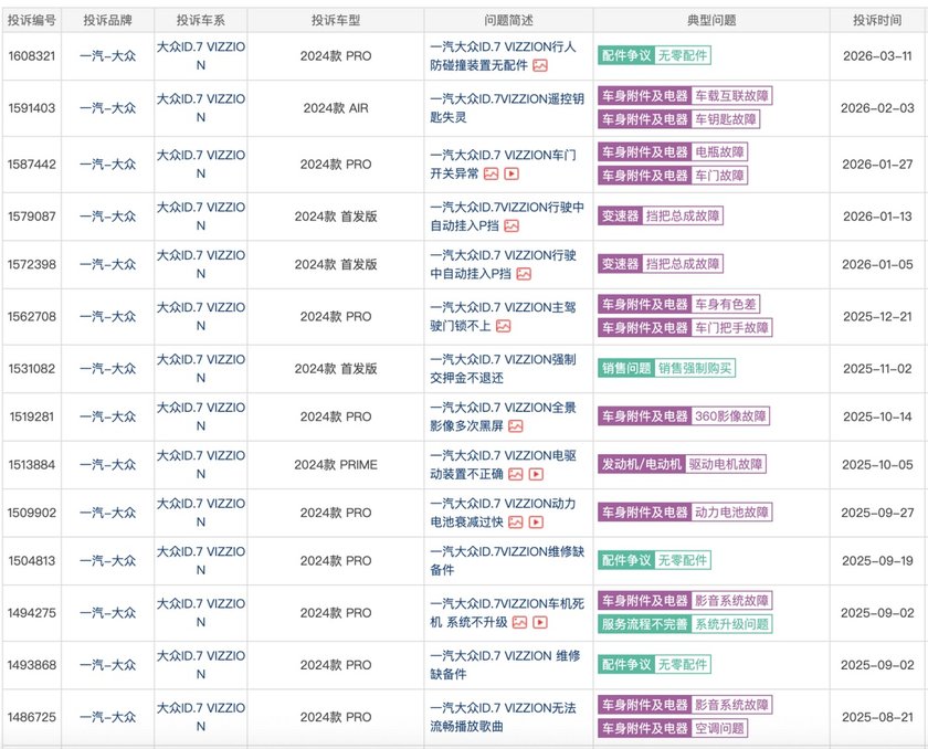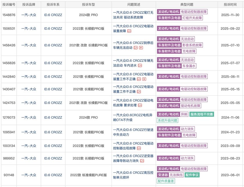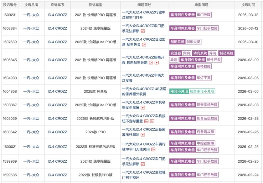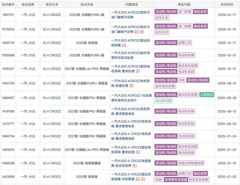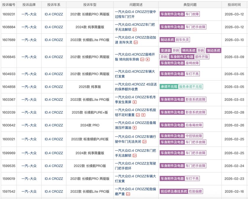 2025年,一汽-大众以158.7万辆的整车销量蝉联合资车企销冠。但这份光鲜的成绩单背后,藏着令人尴尬的另一面:新能源车型销量同比暴跌40%,ID.4 CROZZ全年仅售出2万多辆。更讽刺的是,这款月销不足2000辆的“冷门车”,在某质网上的投诉量却高达数百条——仅2021年5月25日以来,关于ID.4 CROZZ的有效投诉就超过750条。卖不动,却投诉多。这个反差的背后,是一汽-大众ID系列难以回避的质量拷问。