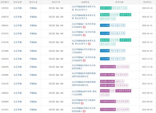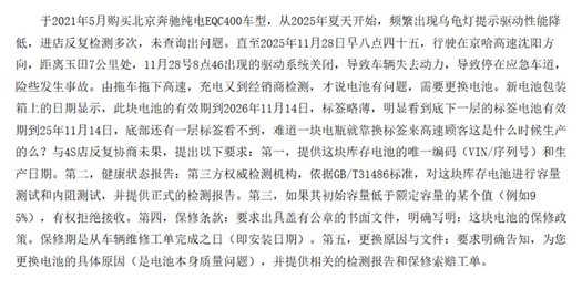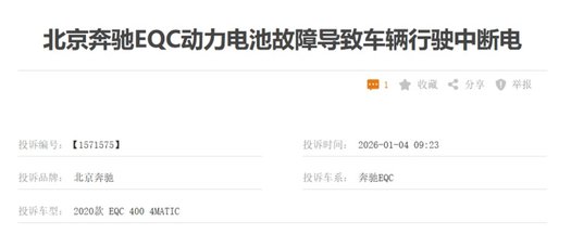 作为奔驰首款纯电车型,EQC从上市之初就深陷电机故障的漩涡,甚至成了车友圈里人尽皆知的“通病”。仅2021到2022年,就有数百位EQC车主集体联名维权,涉及车辆远超万辆,即便奔驰官方承认驱动模块存在制造偏差,却始终回避核心设计缺陷,不肯给车主一个彻底的解决方案。直到现在,车质网上还有诸多关于这款车的投诉。有位车主在车质网投诉:“北京奔驰EQC动力电池故障导致车辆行驶中断电”。