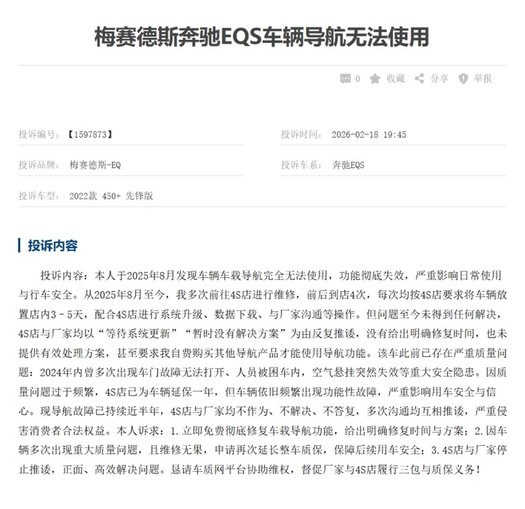 另一位EQS车主更“惨”,先是出现车门故障无法打开、人员被困车内,空气悬挂突然失效等重大安全隐患,之后又因为车辆导航无法使用,接连处理了4次都未能彻底解决问题。