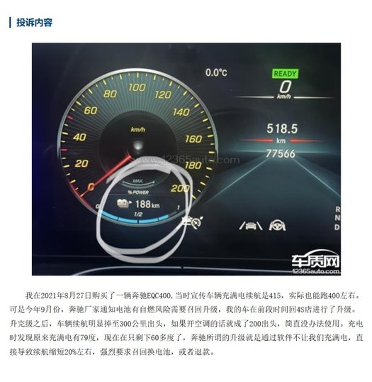 也有奔驰EQC400车主在车质网投诉:当时宣传车辆充满电续航是415,实际也能跑400左右。召回升级之后,车辆续航明显掉至300公里出头,如果开空调甚至会掉到200出头。