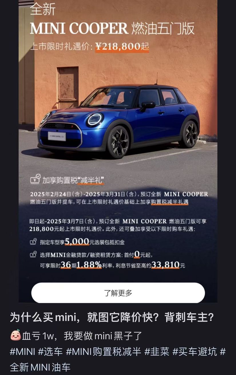 除了这位理想L9车主,特斯拉、MINI等其他品牌的车主,也曾遭遇过类似的价格背刺。如果品牌有保价政策还好,会补给车主差价,若品牌未提供保价政策,消费者往往只能自己承担差价损失。