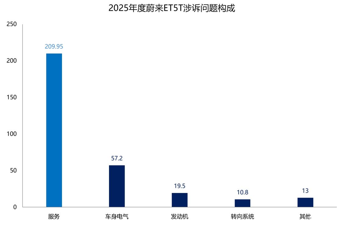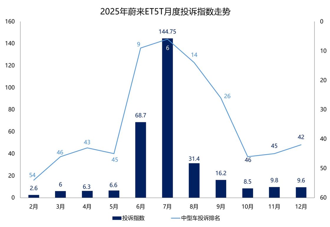 汽车门数据显示:2025年蔚来ET5T投诉指数达到了310.45,同比大涨了490%,在年度中型车投诉指数榜单中位列第20名。