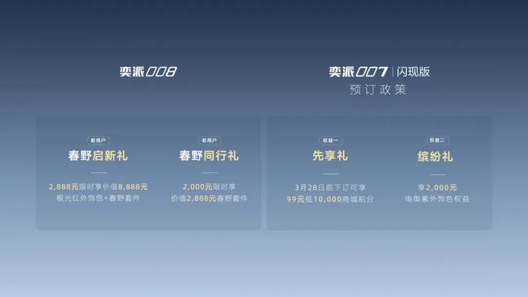 性能上,奕派007闪现版传承ETCR赛道技术基因,搭载冠军团队专业底盘调校,能够适应多种复杂路况,操控和舒适双在线。智能方面,新车搭载双AI大模型智能语音助手、SOA智能座舱等配置,以冠军品质与前沿科技,刷新细分市场价值新标杆。在3月28日前下订,还可享受99元抵10000商城积分的“先享礼”和价值2000元“电御紫”外饰色权益的“缤纷礼”。