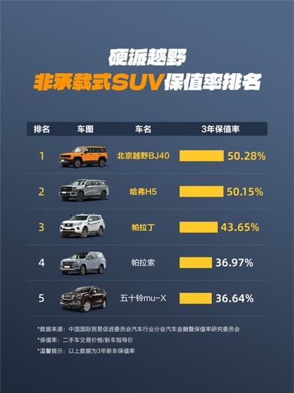 在硬派越野非承载式SUV领域,BJ40的3年保值率独占鳌头,成为该细分市场唯一突破50%大关的车型。这一成绩充分印证了BJ40在可靠性、耐用性及市场流通性方面的卓越表现。