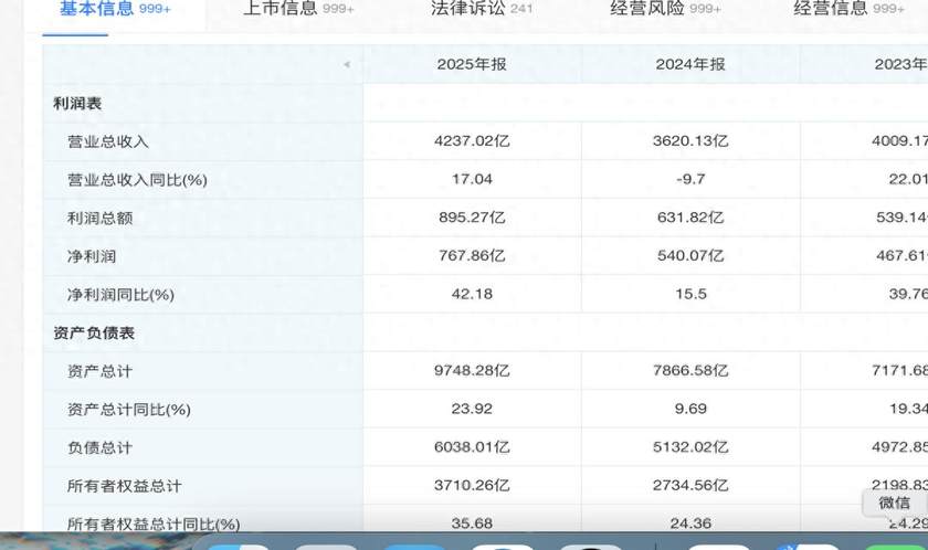 根据天眼查App显示,宁德时代2025年实现营收4237亿,同比增长17%。