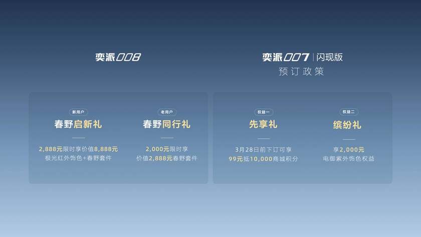 在购车权益方面,东风奕派此次推出的多重福利,精准贴合不同用户的购车需求,以实打实的优惠降低用户购车成本。奕派008针对新老用户推出差异化权益,新用户2888元即可享极光红车色+春野套件(原价8888元),老用户2000元即可入手春野套件;奕派007闪现版在3月28日正式上市前,推出99元抵10000商城积分、免费享2000元电御紫车色的预订福利;而全域覆盖的至高10000元购置税补贴、7年超低息金融政策、置换报废叠加国家补贴至高35000元、奕家人及亲属增购至高补贴15000元等福利,更是覆盖了新购、置换、增购等多种购车场景,让不同需求的用户都能享受到切实优惠。