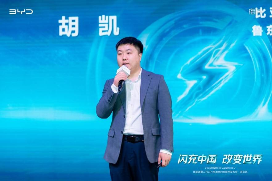 在热烈的氛围中,主持人介绍到场嘉宾并邀请比亚迪海洋网鲁东大区大区经理胡凯先生登台致辞,胡凯先生向到场嘉宾表示衷心感谢。他强调,今年3月,比亚迪正式发布了具有里程碑意义的第二代刀片电池与闪充技术,再次颠覆了新能源补能效率的行业标准。海洋网始终秉持“技术为王,创新为本”的理念,正在引领纯电出行进入“闪充无忧”的全新时代,让用户以高效便捷的方式享受新能源出行。