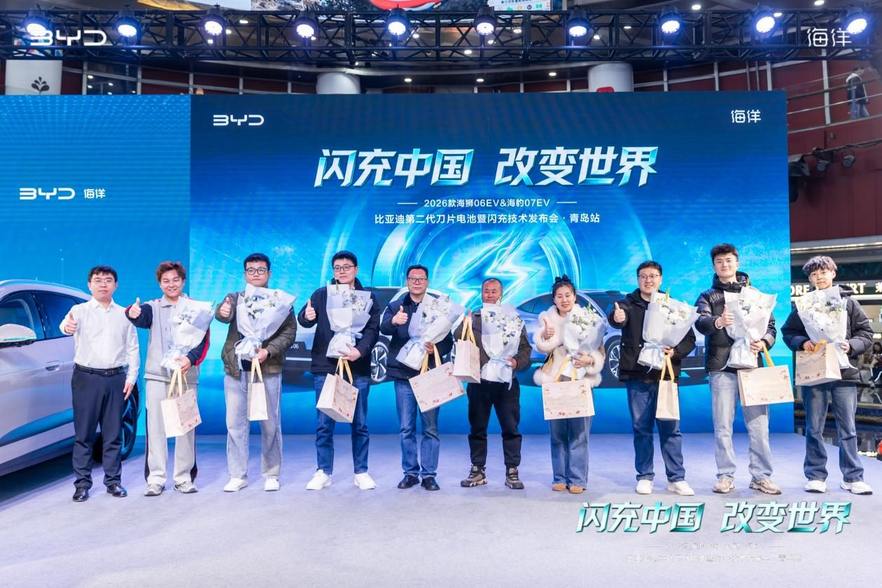 车主证言结束后,比亚迪海洋网到场领导、媒体代表、首批交付车主共同登台,在耀世亮相的 2026 款海狮 06EV 与海豹 07EV 前集体合影留念,定格本次上市品鉴会的高光时刻,也为本次青岛站上市品鉴会活动的核心环节画上了圆满的句号。