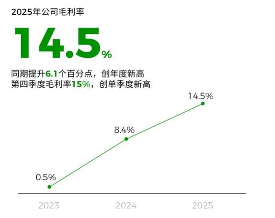 得益于产品的优化组合,零跑汽车的毛利率由2024年的8.4%提升至2025年的14.5%,增长6.1个百分点。其中,2025年四季度单季毛利率更是达到15%,首次达成预设的毛利率目标,也为全年盈利奠定了坚实基础。