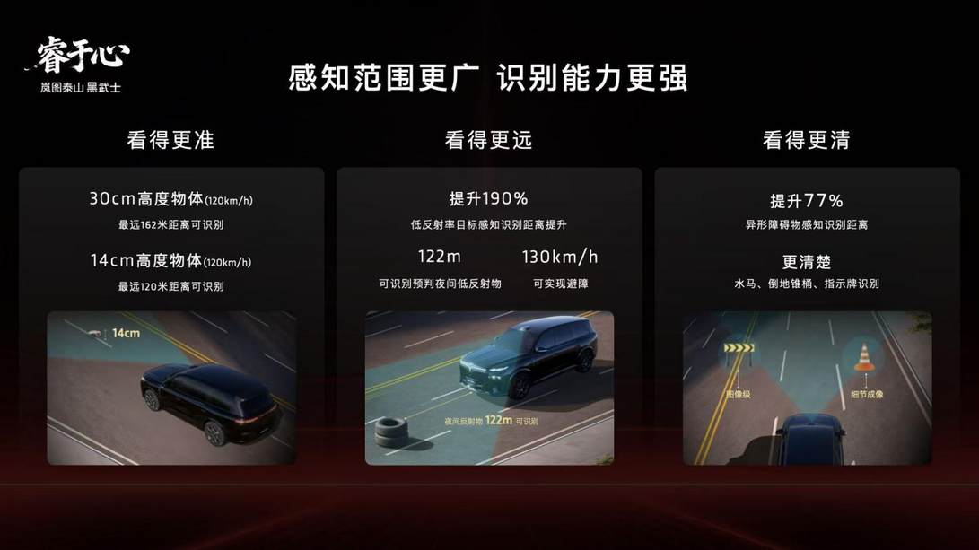 感知硬件是实现L3有条件自动驾驶的基础,岚图与华为优势互补,在高阶智驾系统与高精度感知硬件等方面展开深度合作,华为顶尖技术+岚图全维实力兜底,构筑价值壁垒,真正实现从“特定路况”到“全场景”通用,带来全天候的安稳与从容。岚图泰山Ultra版搭载行业最强四激光雷达矩阵,包含1颗行业量产最高规格的896线双光路图像级激光雷达,相比传统192线激光雷达,896线双光路图像级激光雷达实现了断层领先,针对30cm高度障碍物最远识别距离高达162米,针对14cm小目标也能实现120米远距识别,真正实现了从“点云级”到“图像级”的跨越,是目前行业感知硬件的“天花板”。除四激光雷达外,岚图泰山Ultra版还配备丰富的融合感知传感器,包括高清摄像头、毫米波雷达、超声波雷达等共计34颗智慧传感器。多传感器融合的感知体系,帮助岚图泰山Ultra版搭建起全场景无死角的感知网络。