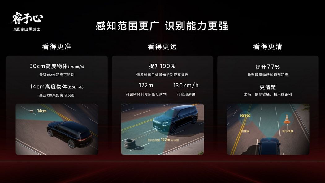 这套多传感器融合的感知体系,为车辆搭建起了全场景、无死角的顶配感知网络与传统。与192线产品相比,新车实现了断层式领先。针对30厘米高度的障碍物,最远识别距离高达162米。即使是14厘米的小目标,也能实现120米的远距精准识别。岚图真正实现了从点云级到图像级的跨越,树立了行业感知硬件的天花板。在央视的权威实测镜头下,这套感知天花板大显神威。面对前车掉落障碍物、异物遮挡视线、驾驶员失能等极其刁钻的突发危机场景,岚图泰山均能在第一时间做出最精准的避险决策,完美化解危机。