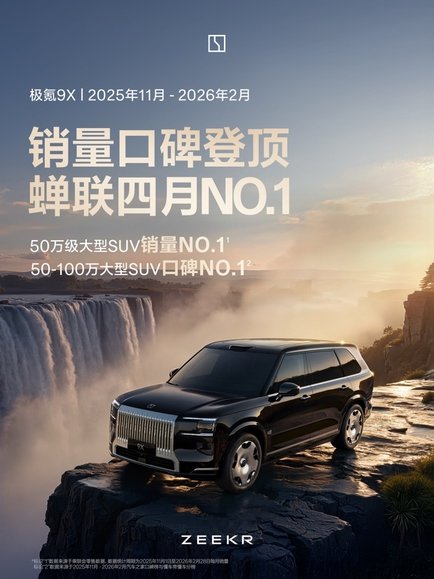 如今,极氪9X以连续四个月蝉联50万级大型SUV销量冠军、近四月登顶50万以上全品类销量榜首的硬核成绩,以每10台50万以上豪车就有3台是极氪9X的统治力,彻底打破百年豪华车市场格局,成为中国汽车向上突破的标志性符号。