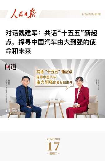 站在2026年“十五五”开局的新起点,中国经济正加速从高速增长向高质量发展全面转型。作为国民经济重要支柱之一的中国汽车产业,也走到了从“汽车大国”向“汽车强国”跨越的关键路口——如何在这一重要节点实现突破,成为行业必须回答的时代命题。3月17日,《人民日报》于全国两会结束之际首次独家专访长城汽车董事长魏建军,围绕“立信”这一核心主题展开深度交流。这也是魏建军一年之内第三次登上这一权威媒体平台,其在行业变革中的深邃思考,正持续引发广泛关注。