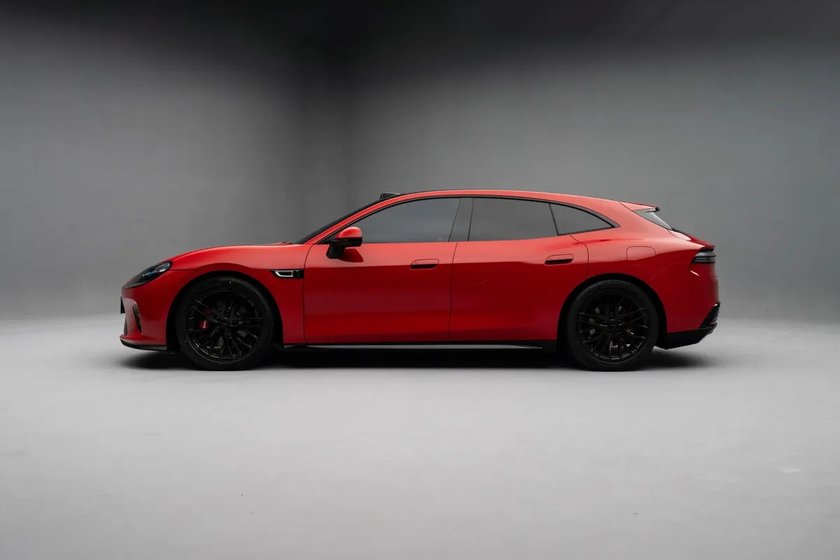 前脸为封闭式纯电专属设计,搭配造型狭长的大灯组,灯组内部配备双透镜结构与上下两条日行灯带,灯腔下方标注“HUAWEI XPIXEL”字样,前翼子板处同样设有蓝色智驾指示灯,能直观展示智驾系统工作状态。车侧配备无框车门与半隐藏式同色门把手,车窗边框及车顶采用黑色处理,搭配21英寸多辐式轮辋与红色刹车卡钳,轮眉轻微外扩进一步强化性能氛围。车尾采用贯穿式尾灯设计,内置526颗光源,分段式智驾小蓝灯支持迎宾展翼、驻车呼吸、光影谢幕三种场景动效,车顶扰流板与黑色后包围让尾部层次感更清晰。