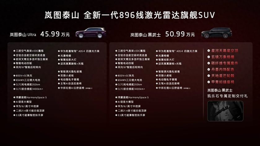 现场,岚图泰山黑武士版也宣布开启大定,新车售价50.99万元。岚图以惊人的速度,率先将顶尖的896线激光雷达量产装车。目前,全国展车及试驾车已全面到店。