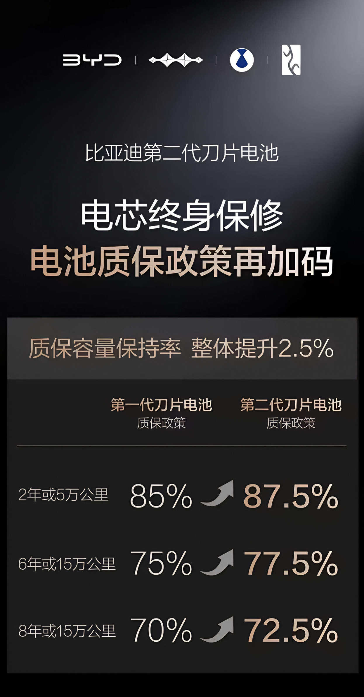 依托于技术带来的产品底气,比亚迪第二代刀片电池将质保政策全面加码,为用户送上安心保障。相较于第一代刀片电池,第二代产品将质保的「容量保持率」整体提升2.5%,在6年或15万公里质保期内,电池容量低于77.5%即可享受免费包换服务;同时,电芯更是提供「终身保修」权益,以行业领先的质保标准,打消用户的用车顾虑。