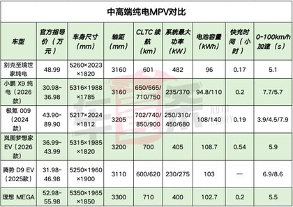 为了更好分析世家纯电版的竞争力,我们将其与小鹏X9、极氪009、岚图梦想家、腾势D9、理想MEGA等主流纯电MPV进行了对比。