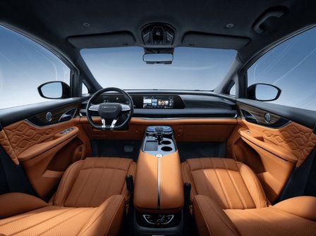 内饰遵循环抱式星舰座舱设计理念,借鉴中国画山水表现手法,打造峰峦叠翠主题造型,水波纹内饰与一叶扁舟式副仪表台相映成趣,东方韵味十足。全车高品质皮质座椅、64色彩氛围灯支持语音声光联动,配合双层夹胶隔音玻璃,营造出静谧舒适的座舱环境。