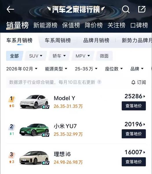 理想i6在解决了供应商产能问题之后,已经在20万—30万元主流纯电动汽车市场与Model Y、小米YU7形成了三强格局,2月份,它在处于产能爬坡状态下依然能以16007辆位居第三。