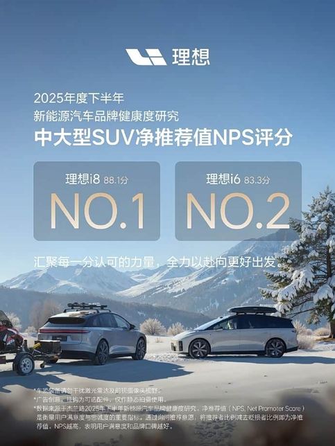 数字背后,是理想i6的口碑,它在2026年初杰兰路发布的《2025年度下半年新能源汽车品牌健康度研究》中,以83.3分的成绩获得了中大型SUV车型用户NPS分数第二名。