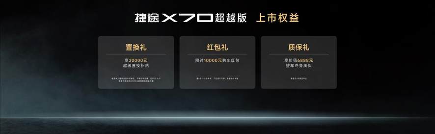 发布会现场,2026款捷途X70超越版的官方指导价及专属购车权益正式公布。2款车型官方指导价9.99万元-10.39万元,提供3重购车豪礼,限时抢购价6.99万元-7.39万元,让更多家庭轻松拥有顾家派宽体大七座,奔赴向往的生活。