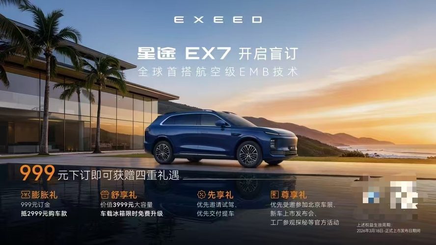 2026 年3月18日,奇瑞迎来 29 周年华诞,在这场以“电池之夜”为主题的品牌盛典上,星途品牌3.0时代的开篇之作——星途EX7成为了最大“彩蛋”。奇瑞汽车股份有限公司执行副总裁李学用宣布,即日起这款性能豪华大五座SUV正式开启盲订。