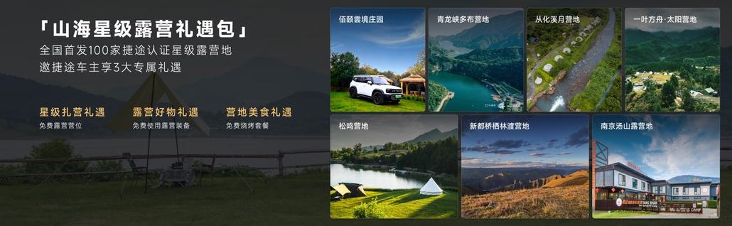 捷途发布旅行小房车繁星计划,首发100家认证星级露营地,为车主提供免费营位、免费露营装备、免费烧烤套餐3大专属礼遇,搭配3大露营生态件权益,降低家庭露营成本,提供更好保障。