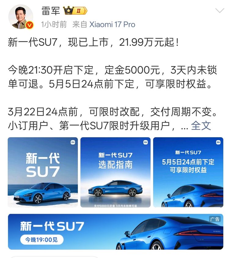 当晚,雷军也是心情大好,尽显大佬风度。发布会上表示,“(新一代SU7)升级的地方超过了100多项,光材料成本就增加了小2万元。但考虑到购置税政策退坡后,我们不想让买新一代SU7的车主超过预算。”“过去大家对我们的交车周期不满意,这一次我们提前两个月做了充分的准备,一定确保大家尽快提车。 ”