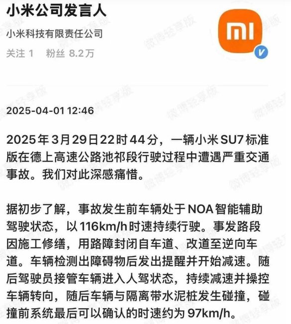 事故发生后,舆论也迅速发酵。部分网友质疑小米SU7的电池安全性,认为其可能存在自燃风险;也有人批评小米汽车的智能驾驶系统未能有效识别障碍物,导致事故发生;更有传言称“事故车辆已被秘密运回北京”,暗示小米试图掩盖真相。面对种种猜测,小米方面在事故发生后第三天(4月1日)正式作出回应。