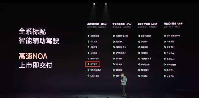 值得注意的是,雷军在讲到智能辅助驾驶部分时,身后大屏幕上关于小米SU7高速领航辅助(NOA)的亮点列表中,清晰展示了“施工避让”这种场景。
