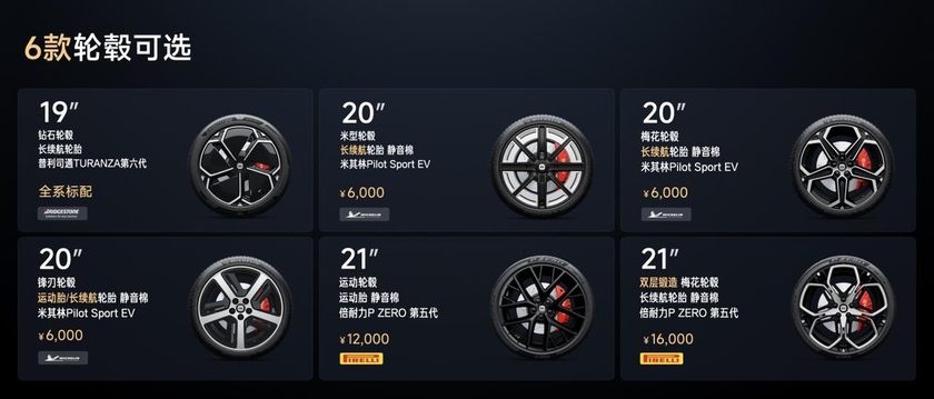 新一代SU7全系提供6款轮毂选择,其中包含3款新轮毂,满足多样化审美需求。全新轮毂为19英寸钻石轮毂、20英寸锋刃轮毂和21英寸双层锻造梅花轮毂。其中21英寸的双层锻造梅花轮毂采用双层结构设计,经13小时铣削成型,使用22把专用单晶金刚石刀具,持续铣削6小时,精准勾勒龙鳞纹路,实现亮面连续、纹理清晰的高阶工艺表现。除此之外,还有经典的20英寸梅花轮毂、20英寸米型轮毂和21英寸运动轮毂可以选择。