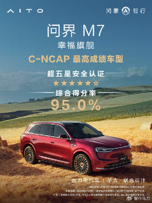 3月20日,中汽中心汽车测评管理中心(简称“中汽测评”)正式公布最新C-NCAP测试结果。“国民SUV幸福旗舰” 问界M7以95%的综合得分率荣获C-NCAP(2024版)超五星安全认证,成为C-NCAP(2024版)最高成绩车型,彰显出卓越的安全性能。