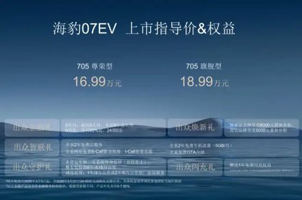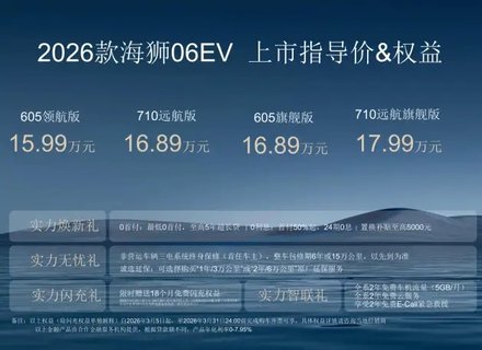 在全场嘉宾的热切期待中,两款新车的价格也在上市盛典中正式揭晓,其中,2026款海狮06EV官方指导价为15.99万元-17.99万元,并推出实力焕新礼、实力无忧礼、实力闪充礼、实力智联礼多重购车礼遇;海豹07EV官方指导价为16.99万元-18.99万元,用户还可享出众金融礼、出众焕新礼、出众智联礼、出众守护礼、出众闪充礼多项购车礼遇。