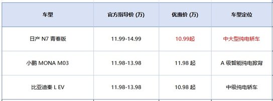 先说大家最敏感的——价格。日产N7青春版官方指导价11.99-14.99万元,限时优惠后直接干到了10.99-13.99万元。小鹏MONA M03官方指导价是11.98-13.98万元,比亚迪秦L EV也是11.98-13.98万元。说白了,这三台车的主销区间高度重合,都在12-14万这个老百姓最关注的价位段。