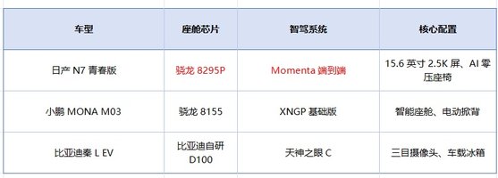 日产N7青春版用上了骁龙8295P芯片,这是个啥水平?是目前不少二十多万电车才用的配置。配上15.6英寸的2.5K屏,手指划过去的感觉,跟滑几千块的平板差不多,没有那种廉价的延迟感。小鹏MONA M03是8155芯片,日常用也够,但跟8295P比,算力上确实有代差。比亚迪秦L EV用的也是国产芯片,主流水平。在同样的价位段,N7在座舱芯片上给的确实更“满”。