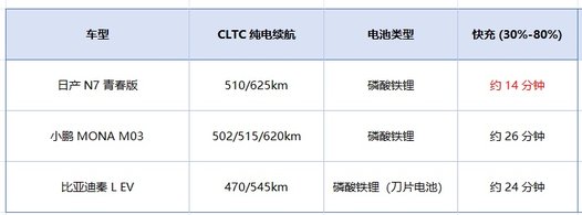 这方面咱们也看看硬指标。日产N7青春版快充从30%到80%,官方给的数据是13.8分钟。比亚迪秦L EV大概是24分钟。小鹏MONA M03差不多26分钟左右。简单换算一下,同样在服务区充电,可能你买杯咖啡上个洗手间,N7那边已经充得差不多可以拔枪走人了,另外两台可能还得再等一会儿。
