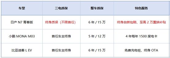 另外,整车质保给到了6年或15万公里。比亚迪秦L EV也是6年或15万公里,小鹏MONA M03是5年或12万公里。别小看这一年的差距,车子开到第五年,要是真出点啥毛病,多一年质保就少花一笔钱。
